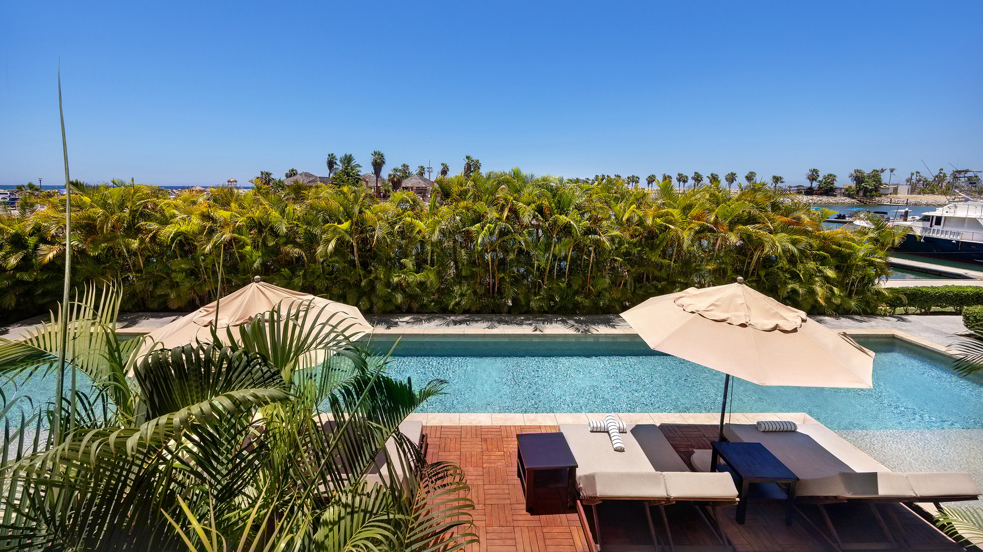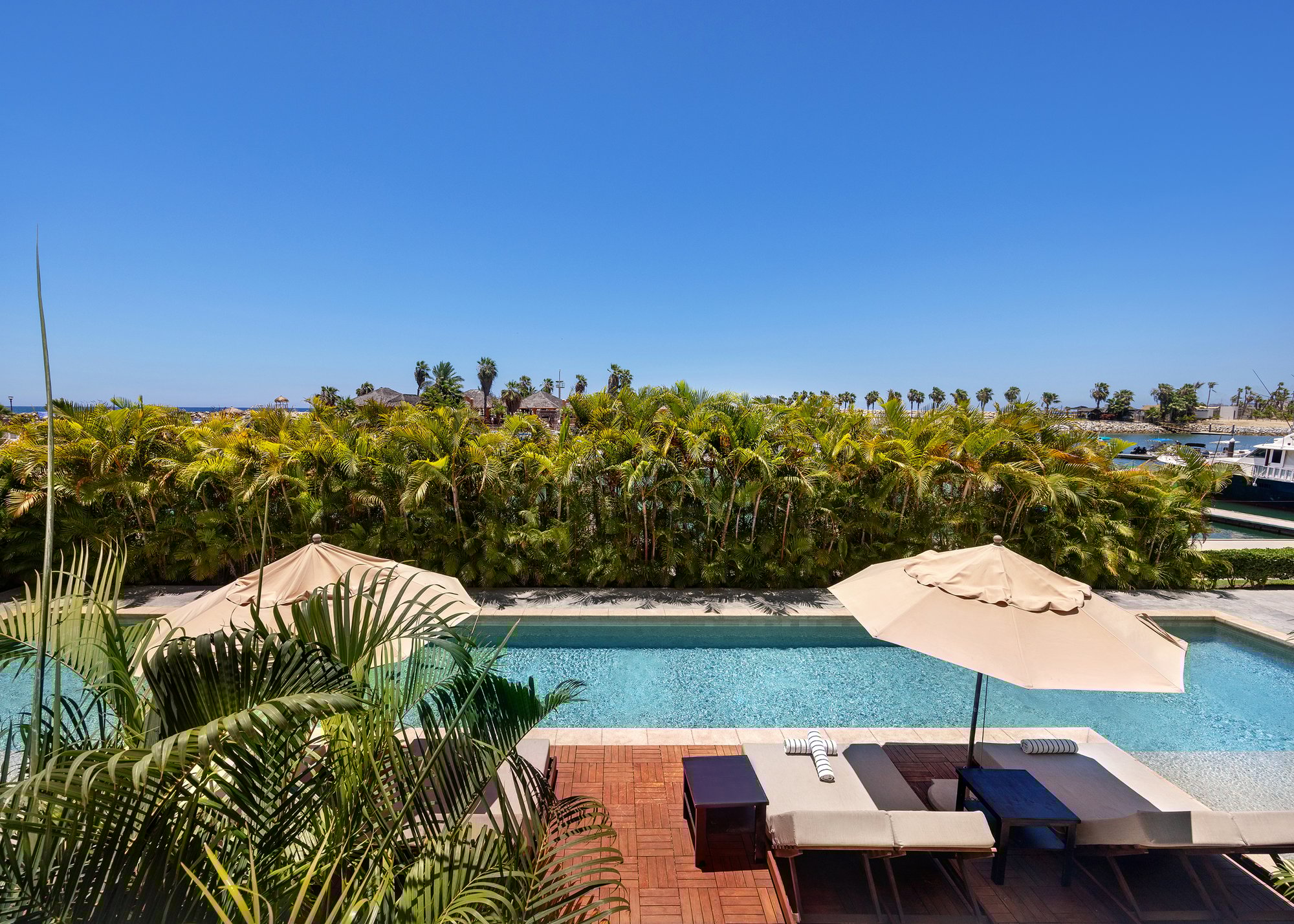Puertas corredizas de vidrio estilo Julieta para disfrutar de las vistas panorámicas del mar y de la Marina Puerto Los Cabos.