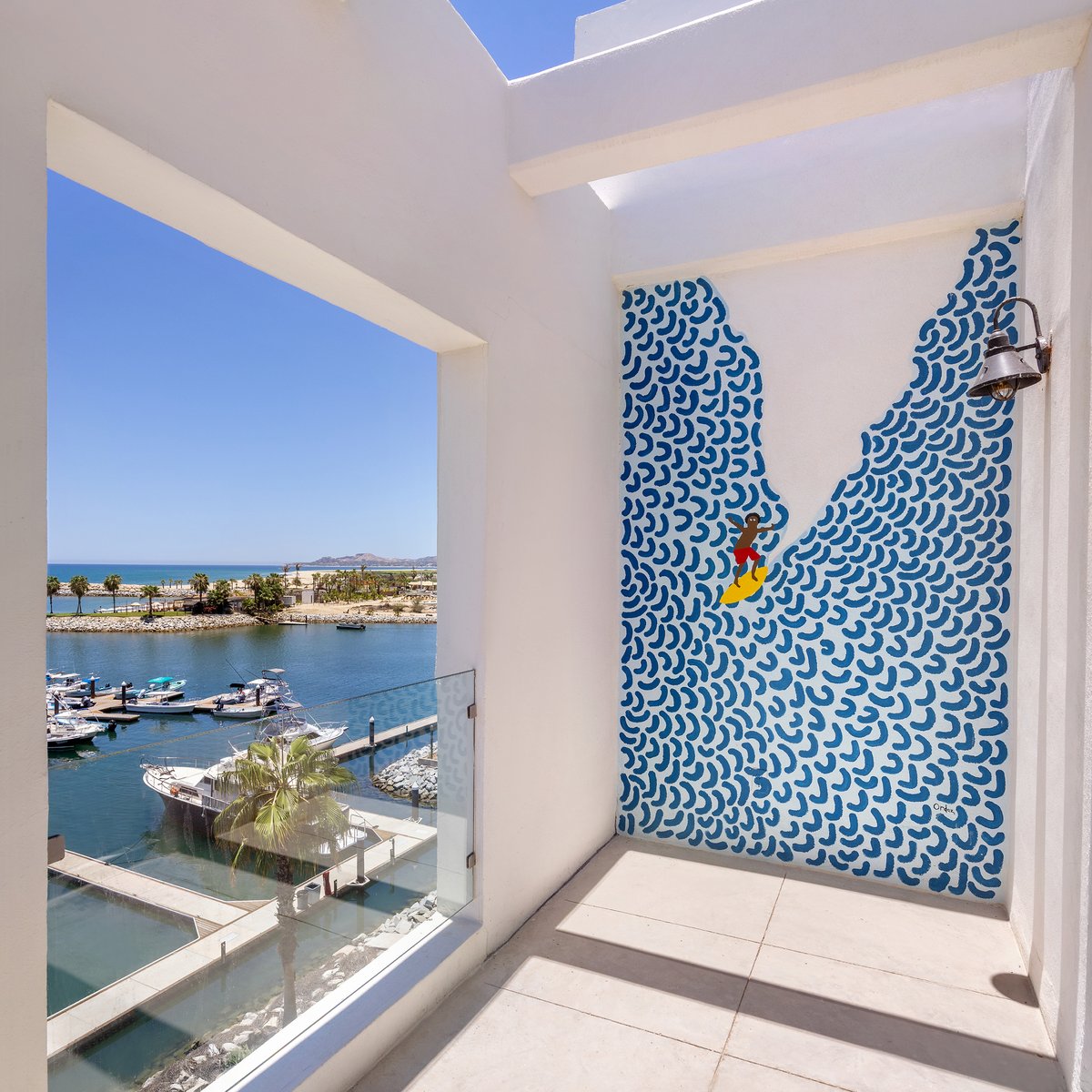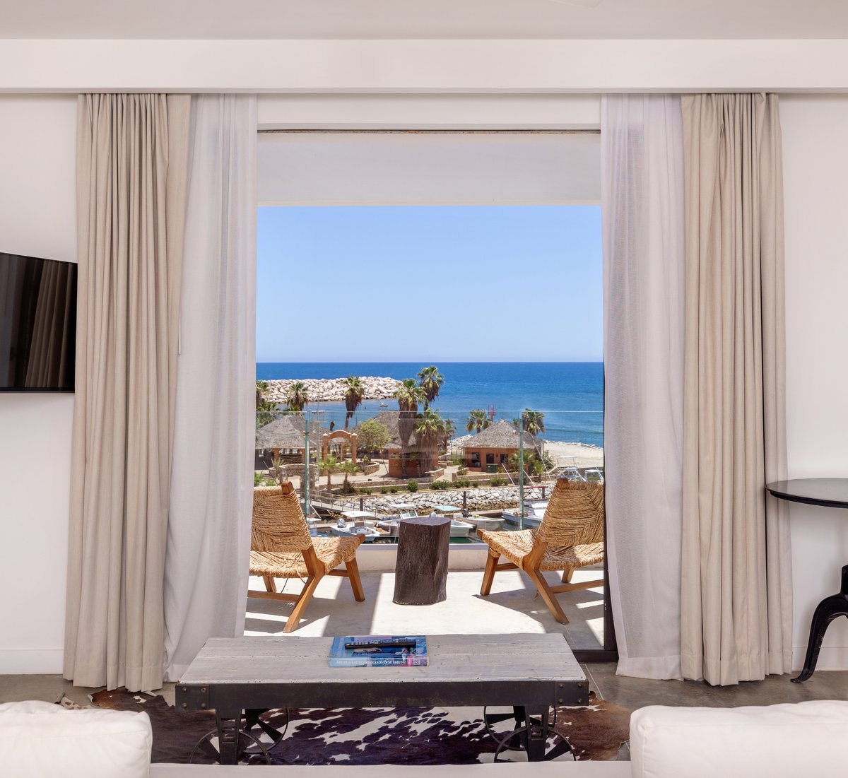Puertas corredizas de vidrio estilo Julieta para disfrutar de las vistas despejadas del mar y de la Marina Puerto Los Cabos con balcón al aire libre.