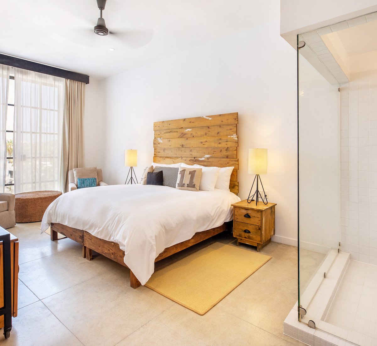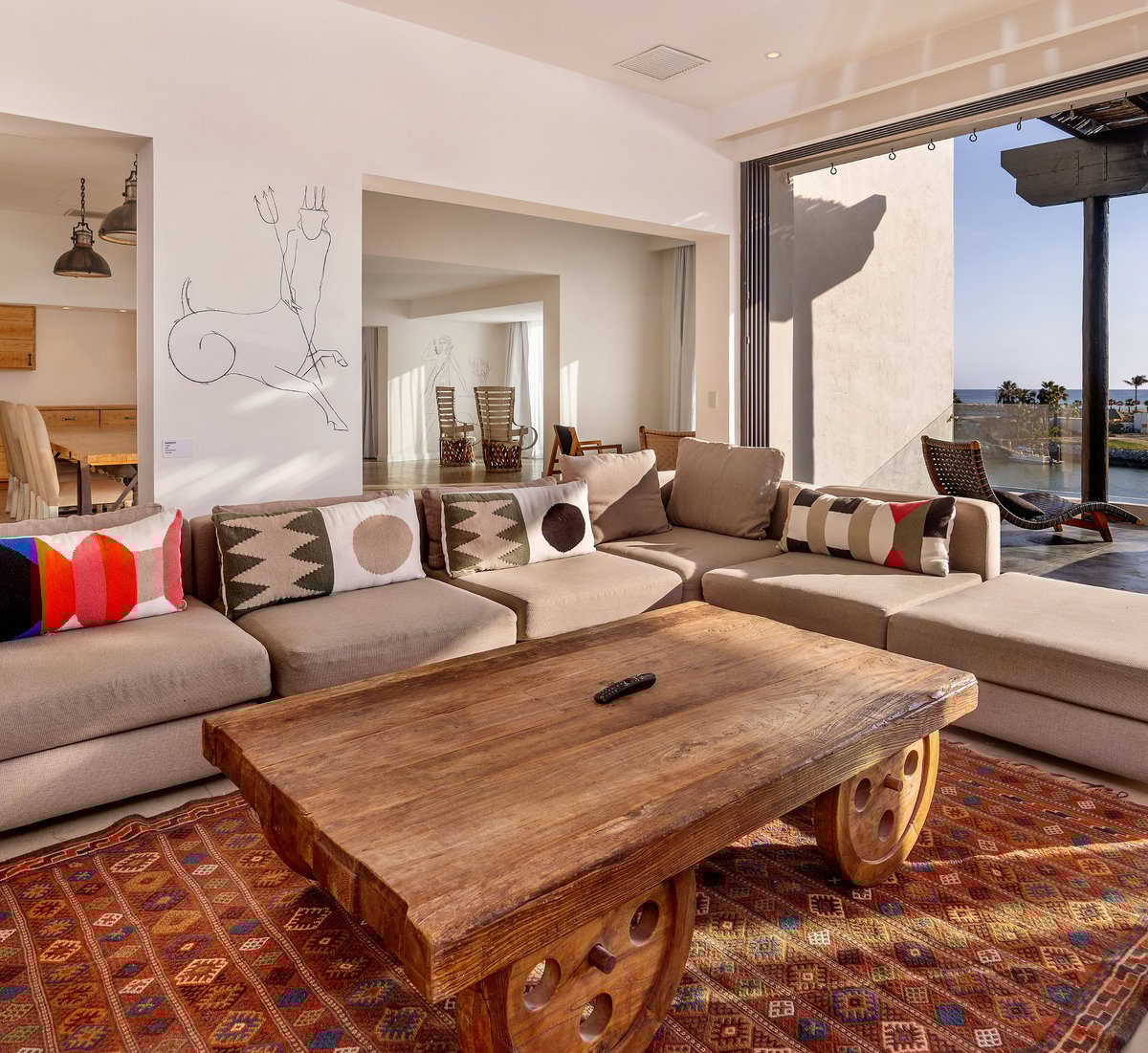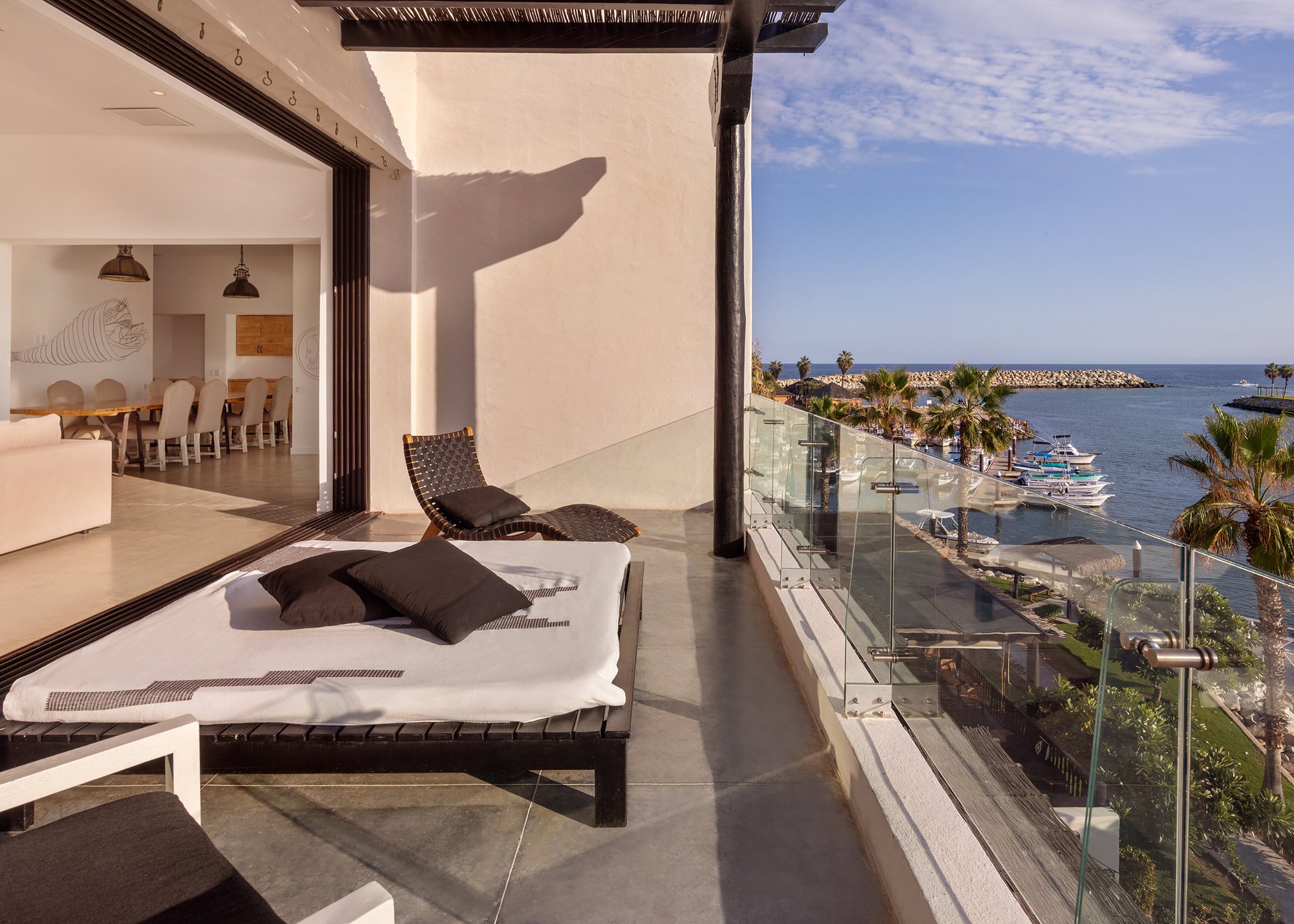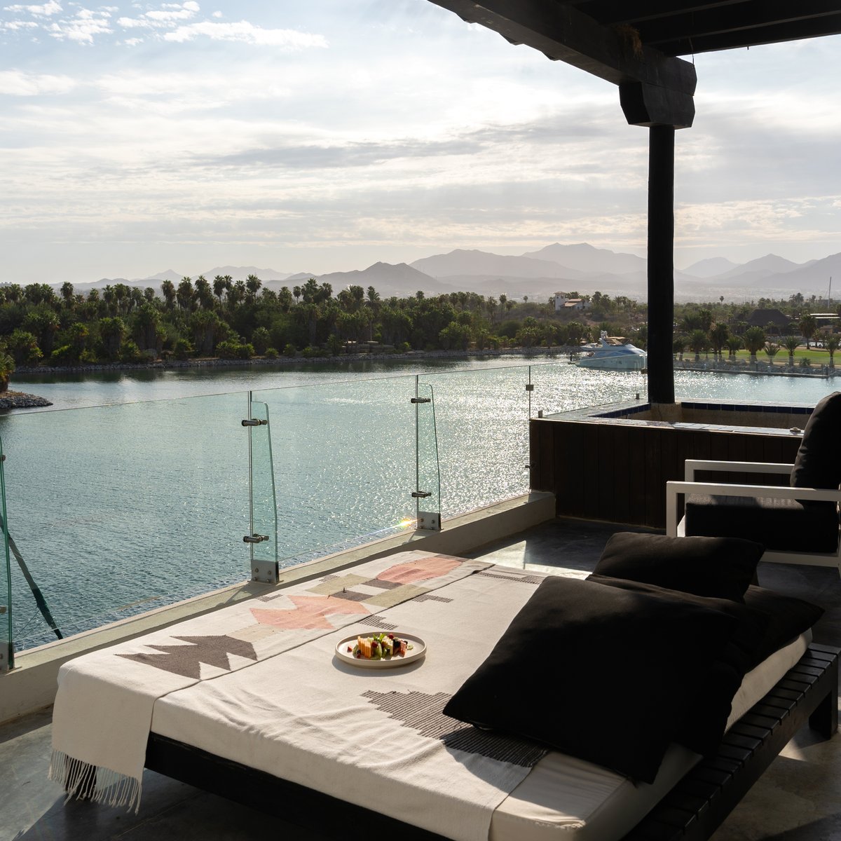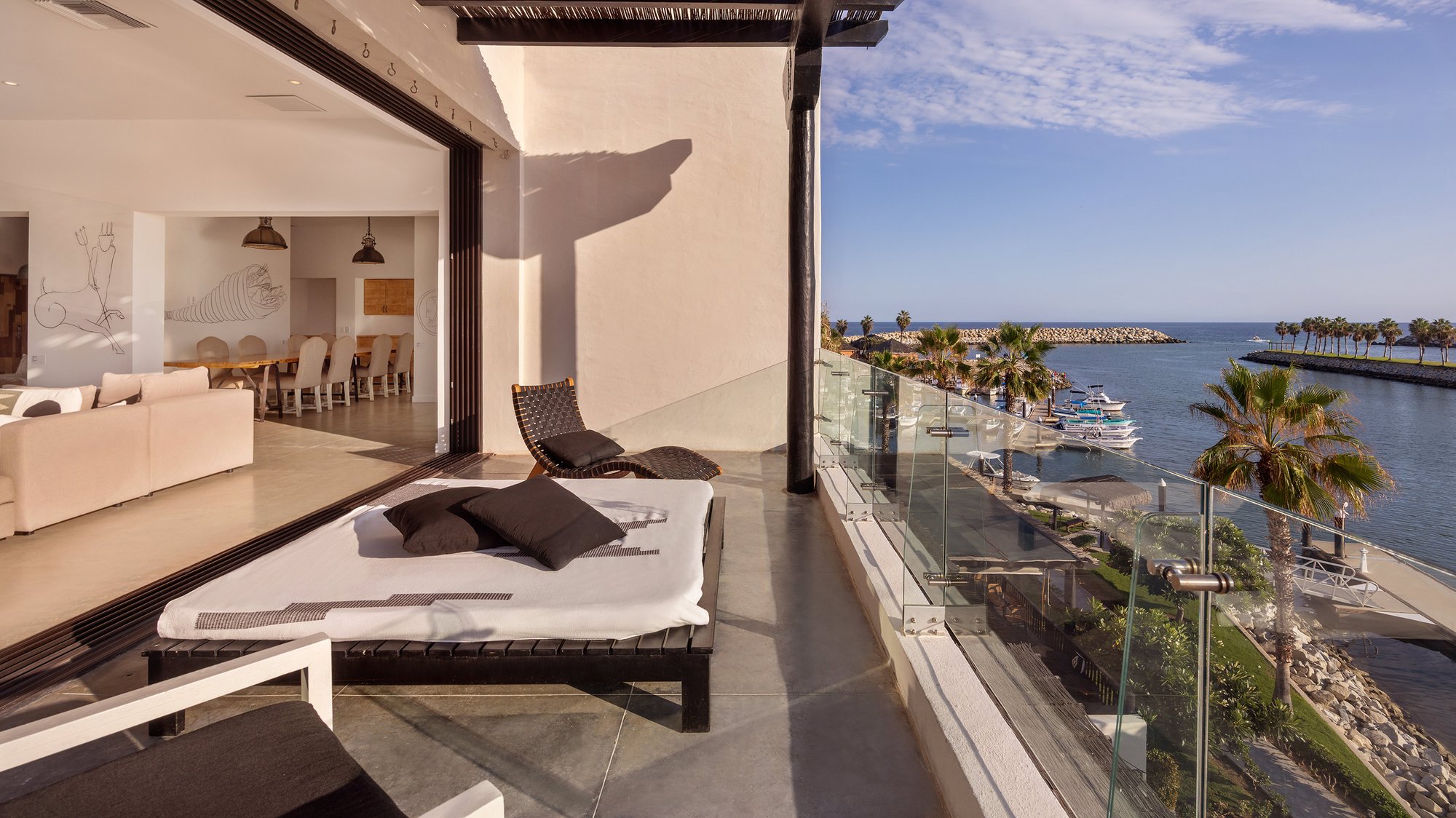 Puertas corredizas de vidrio estilo Julieta para disfrutar de las vistas panorámicas del mar y de la Marina Puerto Los Cabos, con terraza al aire libre y jacuzzi.