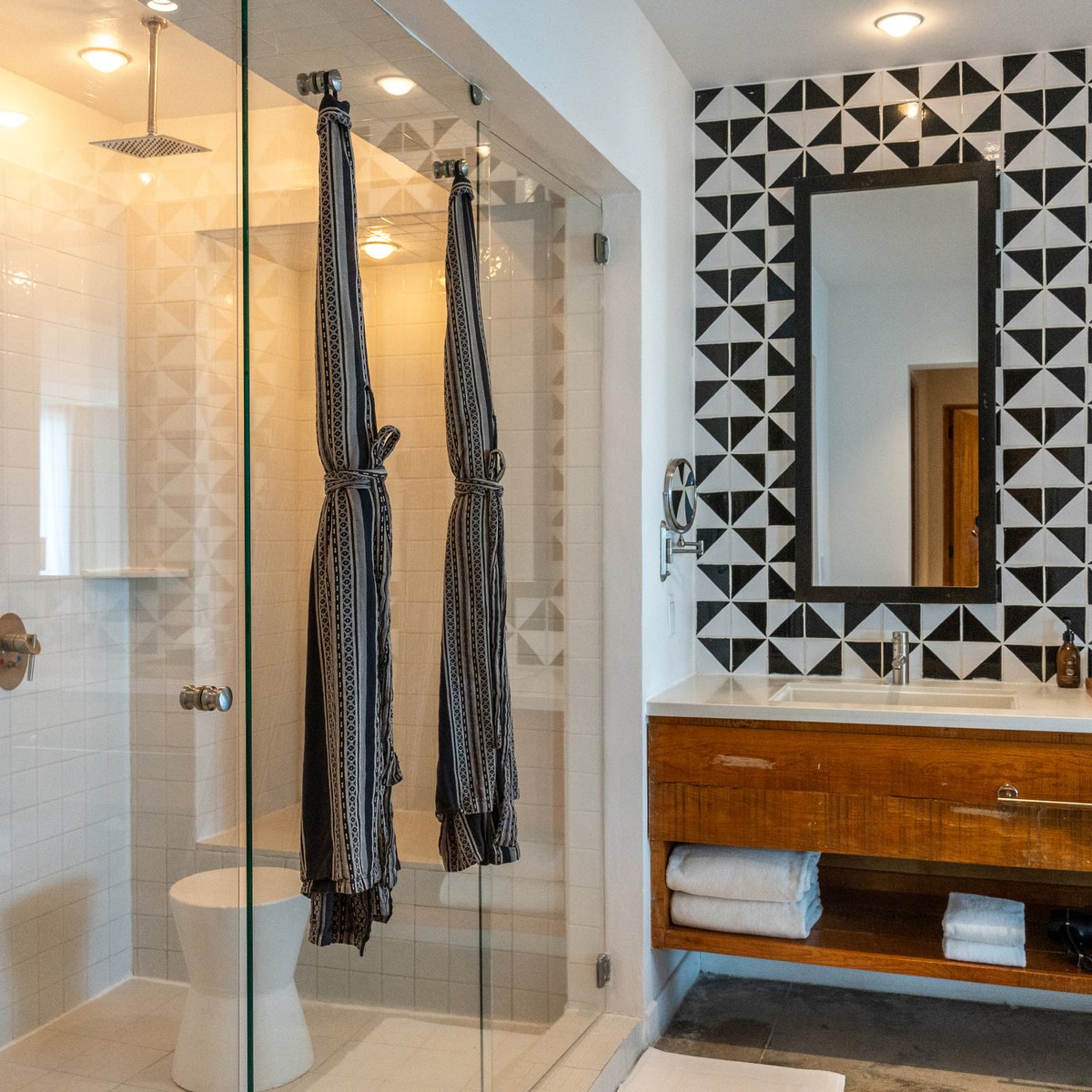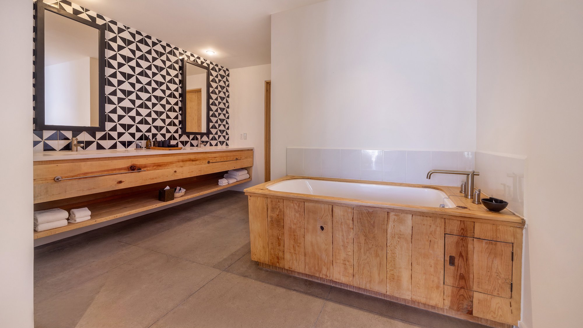 El cuarto de baño, de azulejos blancos brillantes con detalles en madera rústica, cuenta con ducha, tina independiente y productos de baño de fabricación local.