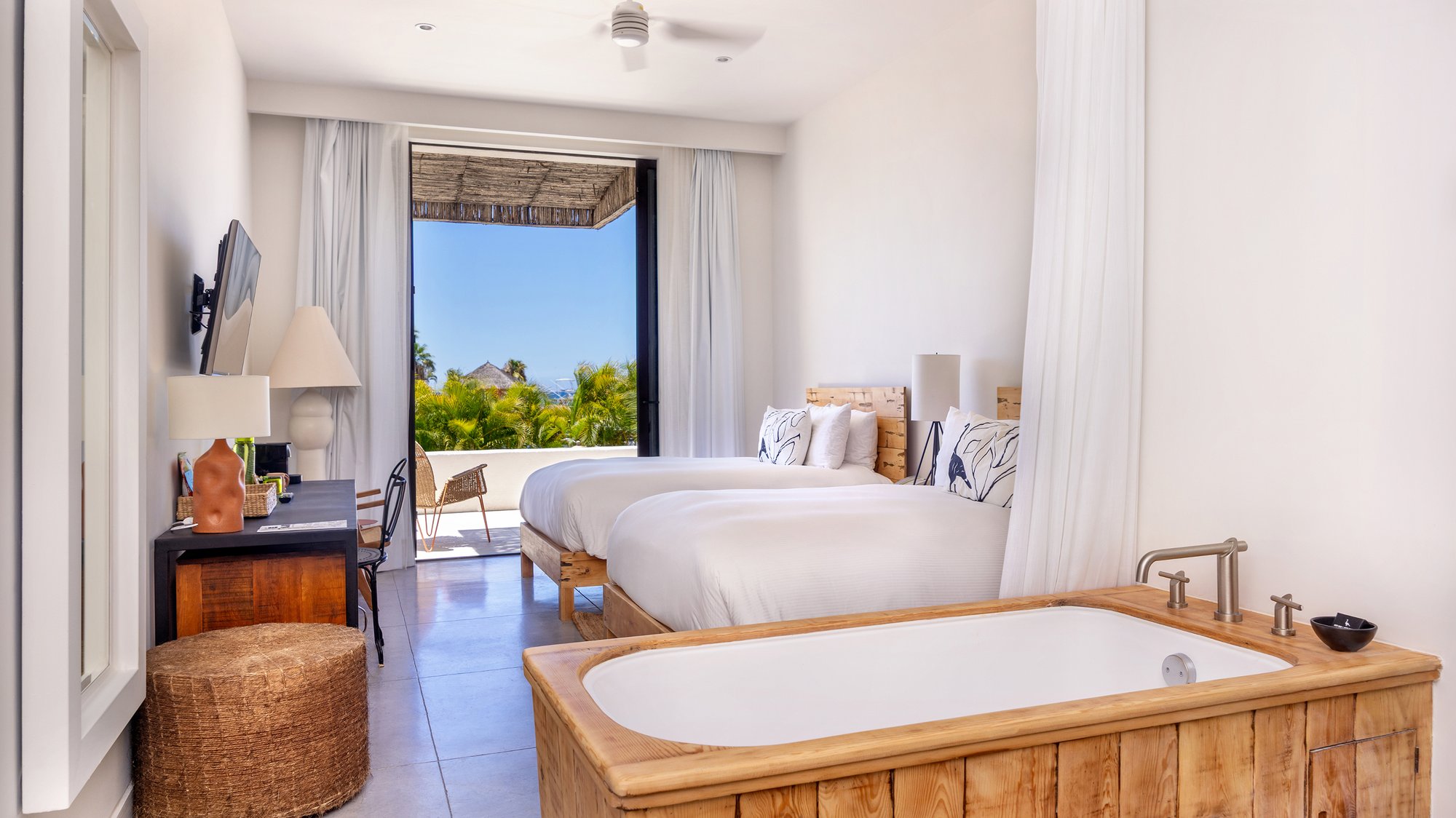Esta habitación con terraza y cama doble ofrece espacio para compartir, sin renunciar a la libertad de retirarse. Ideal para compañeros de viaje, cuenta con un espacio exterior privado, interiores inspirados en Baja California y camas queen size con suaves sábanas. El ritmo aquí es pausado y las comodidades son inconfundiblemente Ganzo.