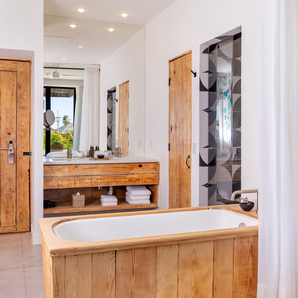 El cuarto de baño, de azulejos blancos brillantes con detalles en madera rústica, cuenta con ducha, tina independiente y productos de baño de fabricación local.