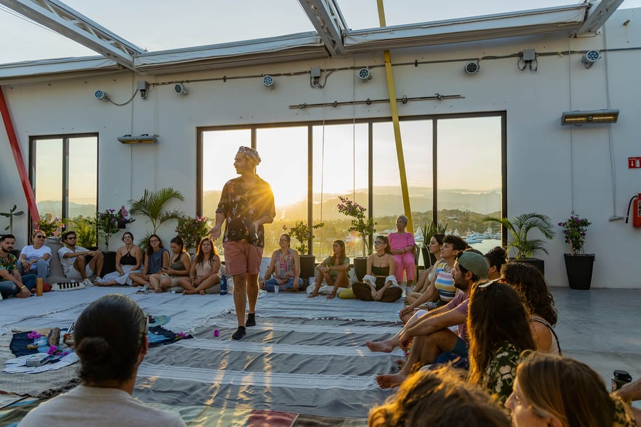 A dedicated corner of the rooftop, this space is designed for moments that revolve around rhythm, presence, and connection. Framed by open sky, mountain silhouettes, and the shifting colors of the sea, it holds a kind of quiet intensity—whether in motion or stillness. By day, it lends itself to wellness-led gatherings: breathwork, sound journeys, and movement practices carried by ocean air. As the light softens, it transitions effortlessly into intimate sets, sunset sessions, and small-scale concerts that feel both personal and expansive. It’s also a natural setting for private gatherings—celebrations, curated experiences, or moments that call for music as the central thread. Minimal yet charged, The DJ Booth is a space to gather around sound, energy, and atmosphere—overlooking it all, yet deeply grounded in the moment.