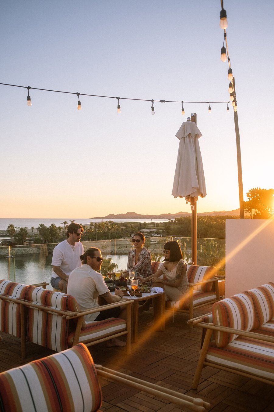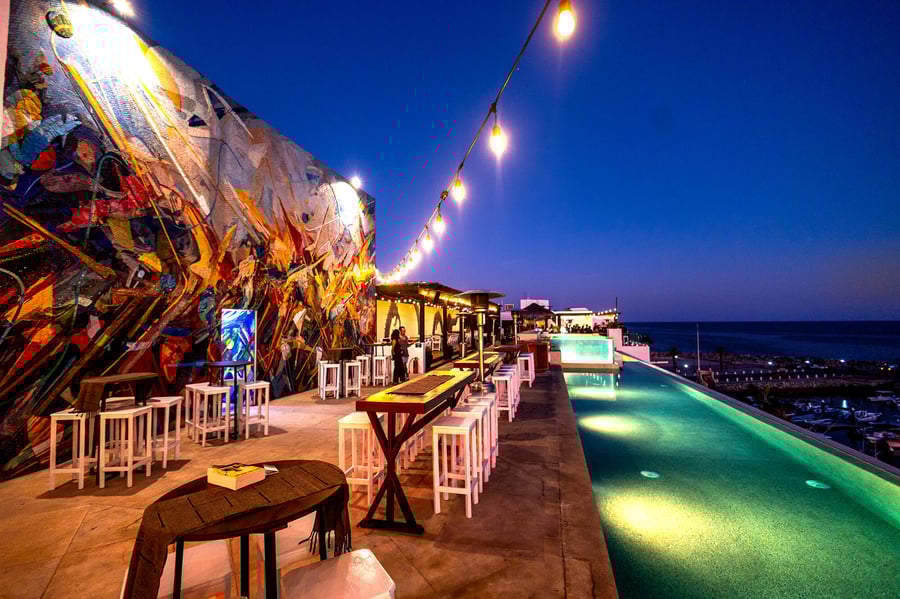 Desert, ocean, and mountains collide in a panorama that feels almost unreal. Perched above the marina, El Ganzo Rooftop offers one of the most spectacular viewpoints in Puerto Los Cabos, where sunsets stretch long and the horizon shifts through every shade of gold. This open-air sanctuary has also become a natural stage for unforgettable gatherings. Dinners, concerts under the stars, dance floors beneath the moon, or intimate celebrations framed by the sea, the rooftop transforms effortlessly with the moment. An infinity pool, jacuzzi, and sun-soaked lounge areas invite guests to linger long after the first drink. Overlooking it all is The Shudder of the Mountains, a striking mosaic mural by artist Omar Rodríguez-Graham, a reminder that at El Ganzo, art is always part of the atmosphere. Whether it’s a sunset cocktail, a celebration with friends, or a full-scale event beneath the Baja sky, the rooftop is a space where moments unfold naturally; and memories tend to stay a little longer.