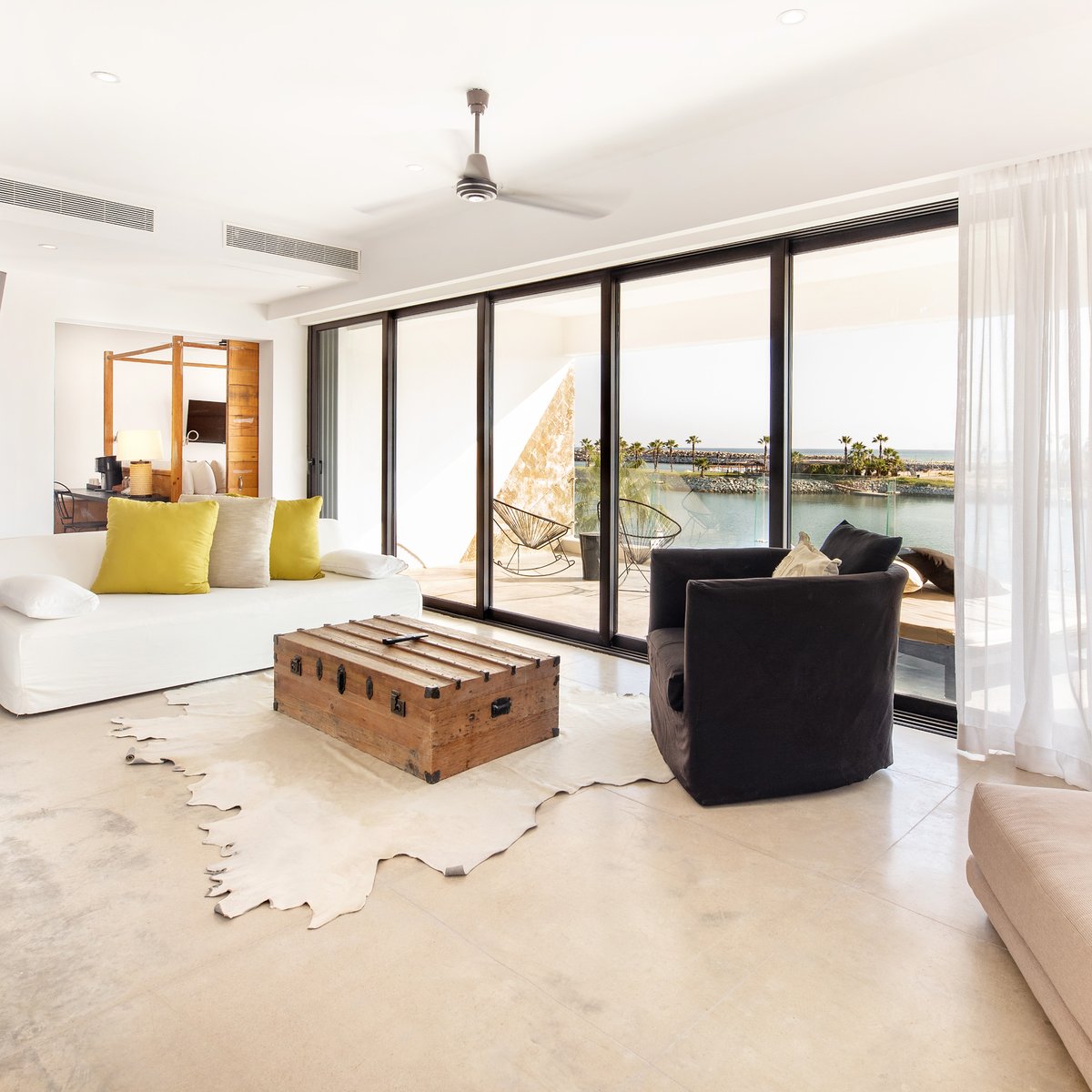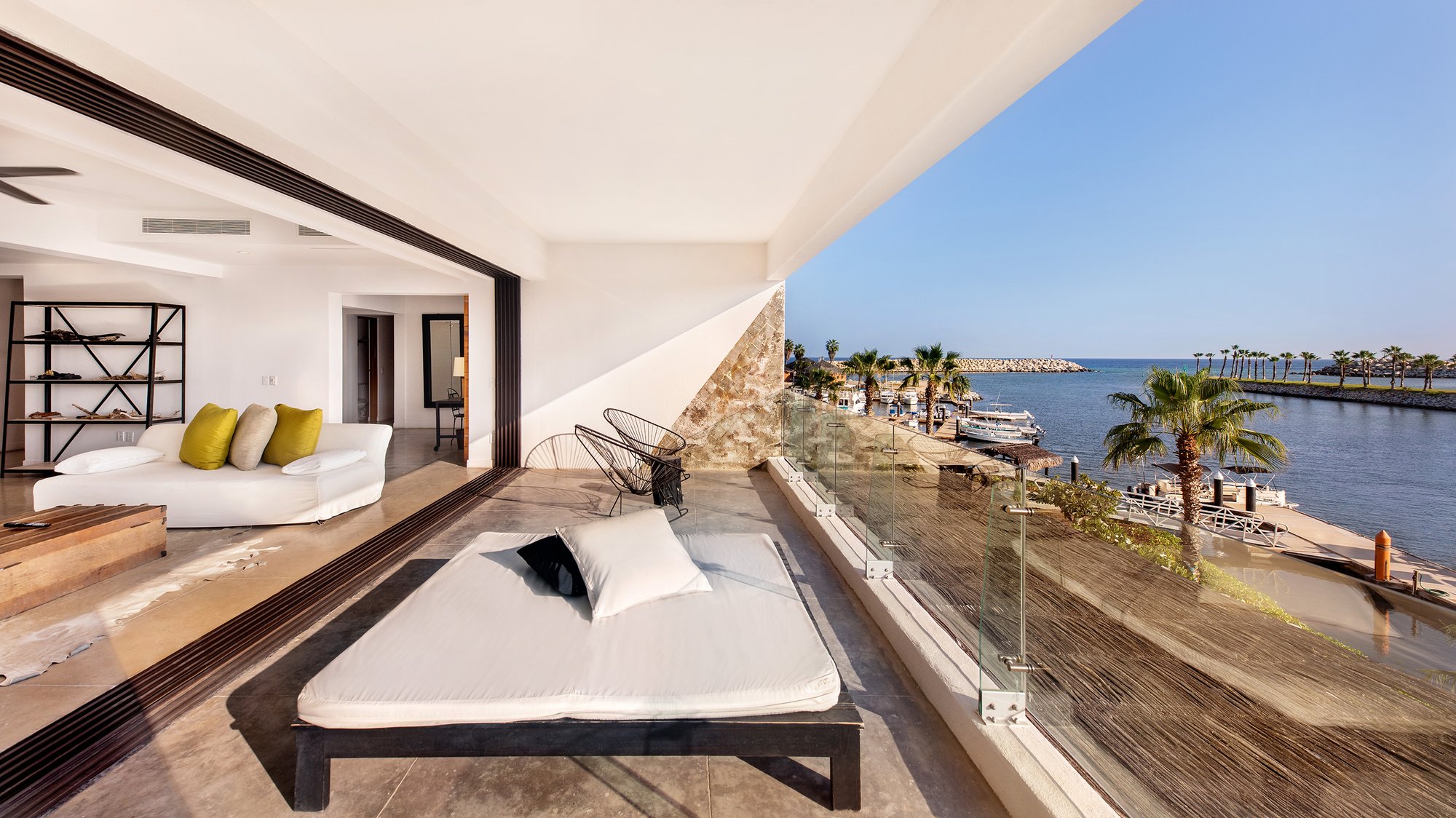 Juliet-style sliding glass doors for taking in the clear ocean views and Marina Puerto Los Cabos with outdoor terrace.