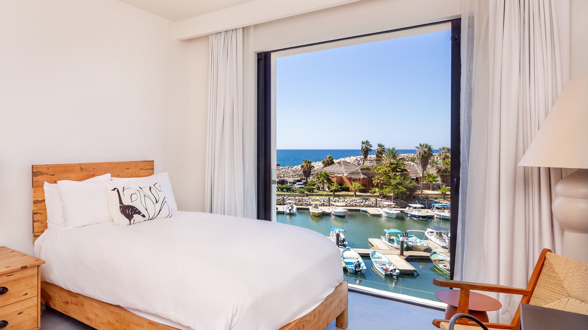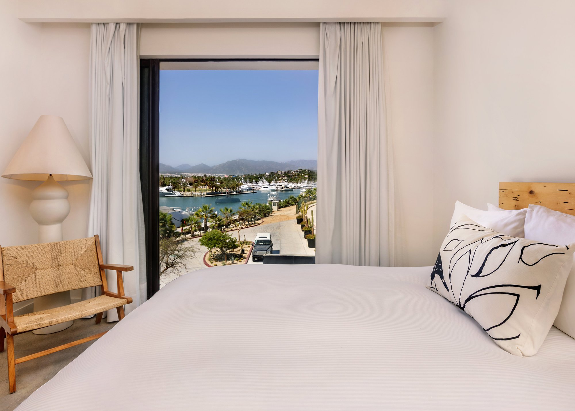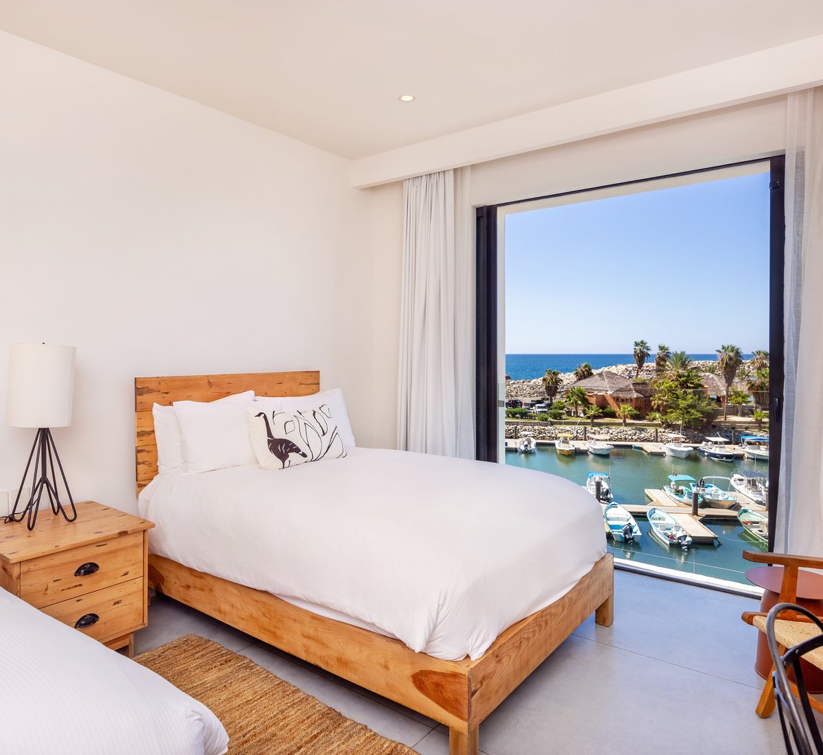 Juliet-style sliding glass doors for taking in the clear ocean views and Marina Puerto Los Cabos