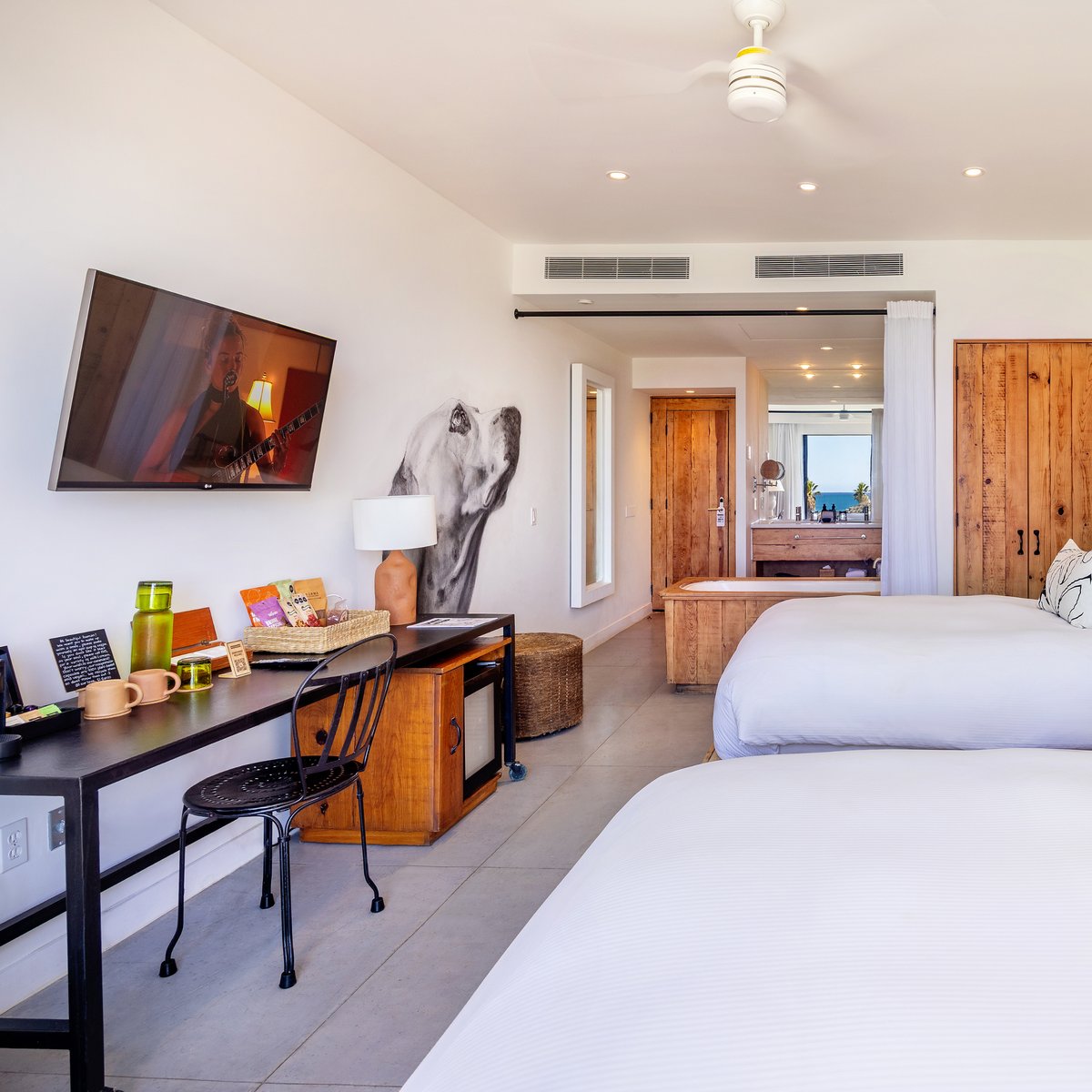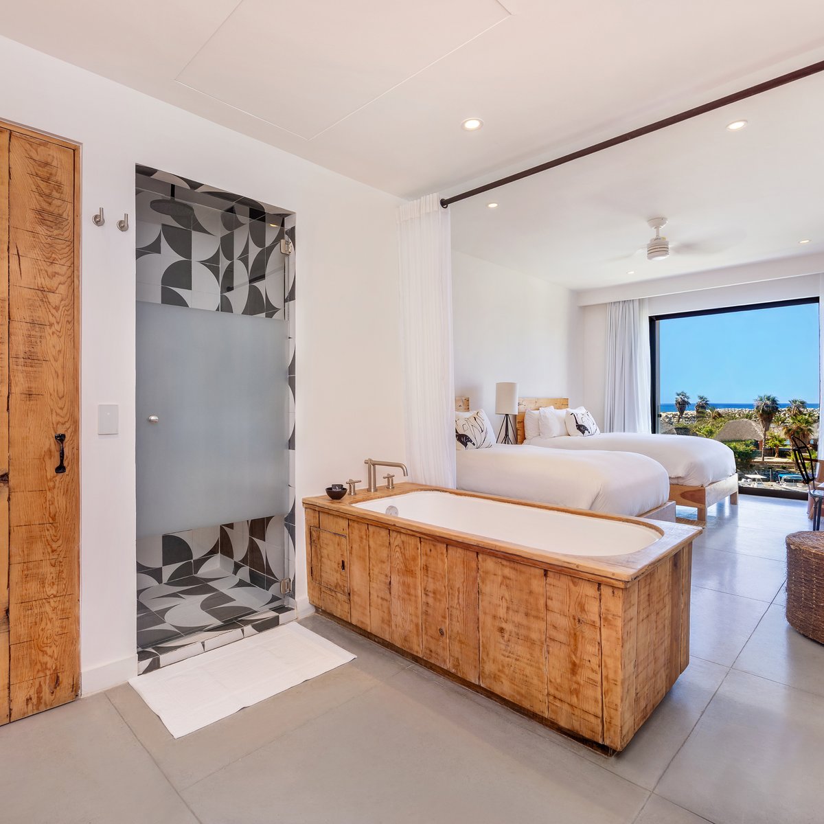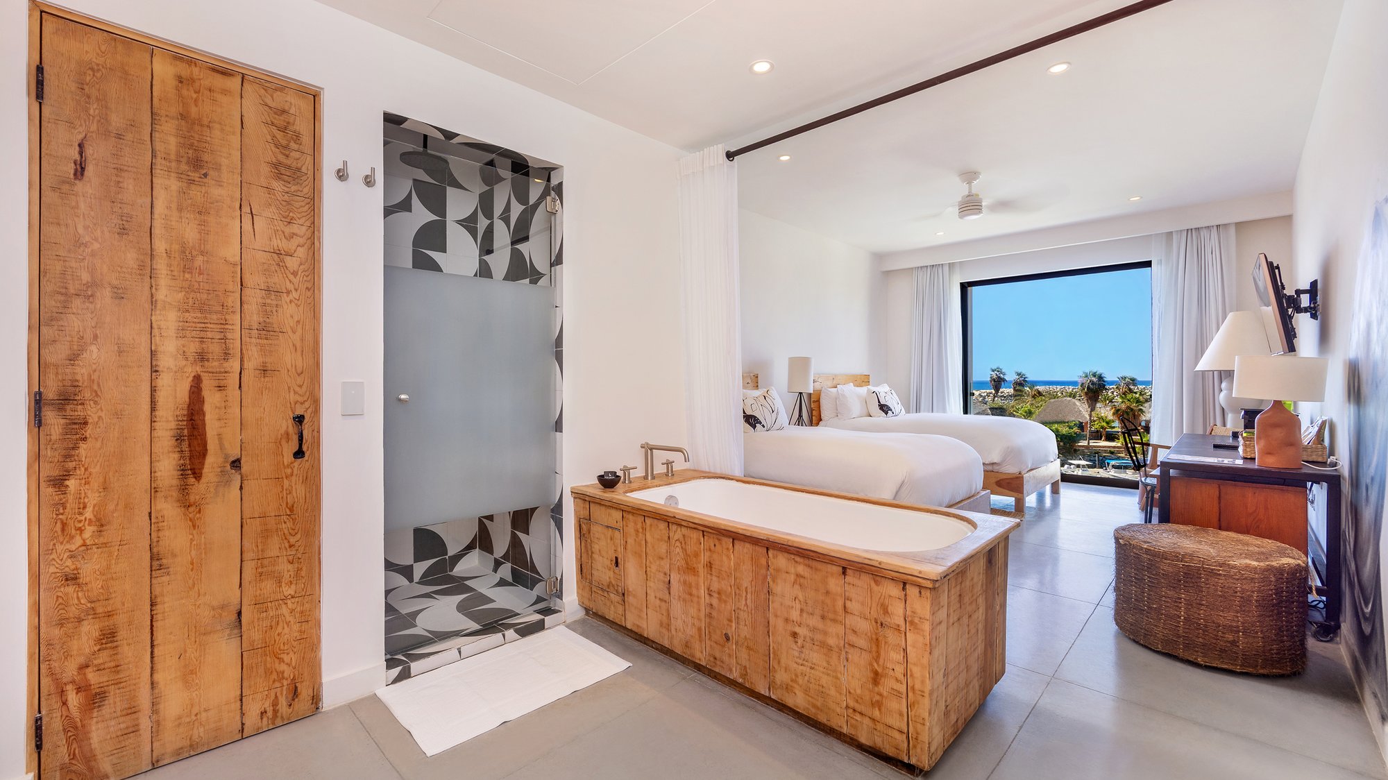 Whether traveling with friends, siblings, or soulmates, the Oceanview Double is a room that brings people closer—without giving up personal space. With two cozy beds, a generous soaking tub and separate shower, and handcrafted amenities, this space is made for unwinding after a day of exploring Los Cabos. The view is the real showstopper, but thoughtful touches like Baja bath salts, your own espresso setup, and a Marshall speaker (on request) round out the experience. A hideaway that feels just right for many.