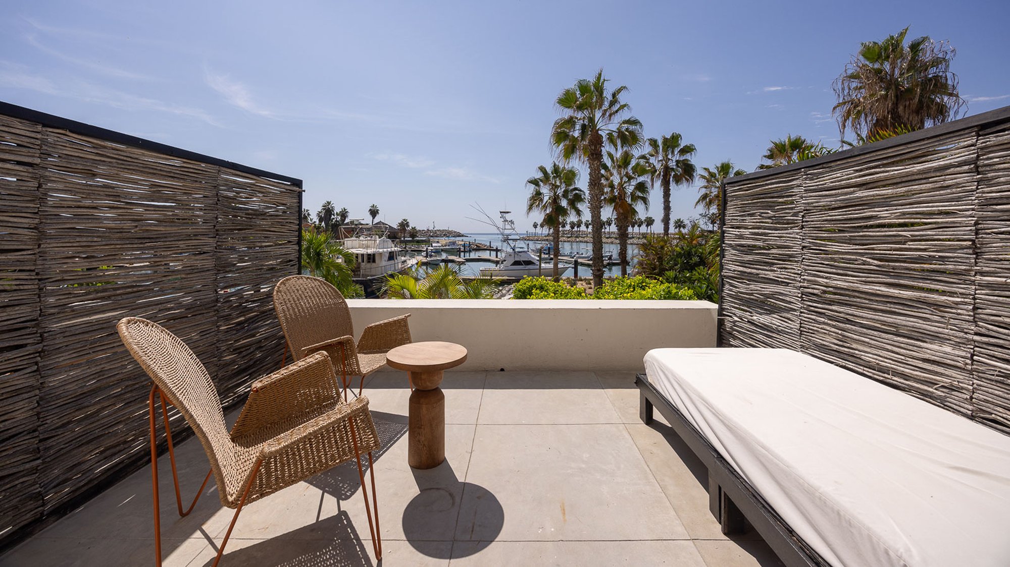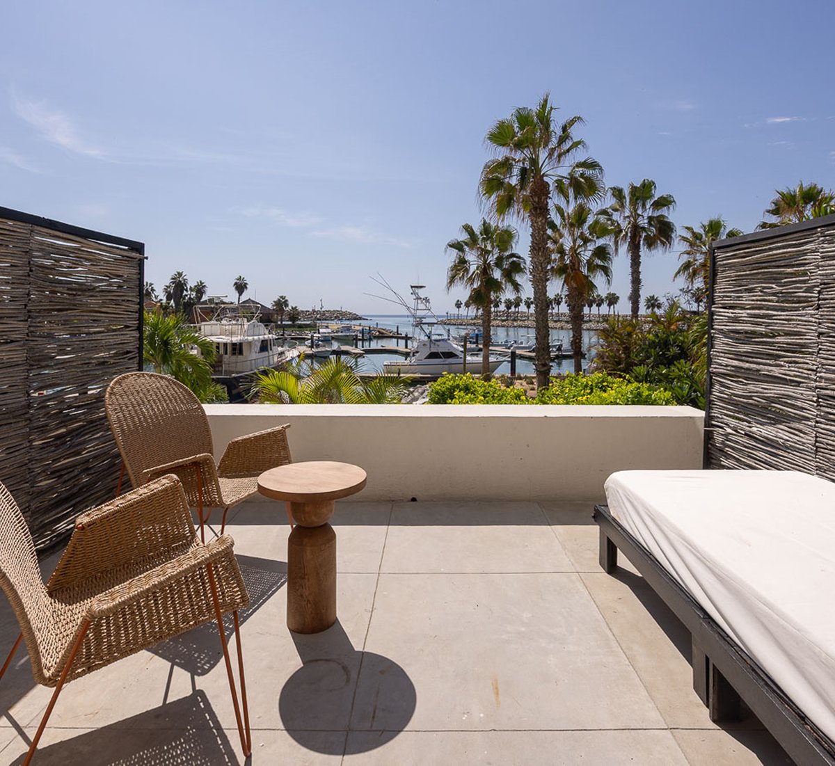 Juliet-style sliding glass doors for taking in the clear ocean views and Marina Puerto Los Cabos with outdoor terrace.